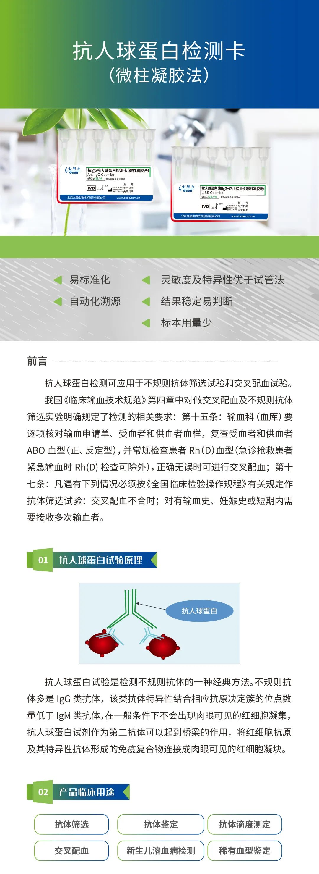 本试剂盒用于间接抗人球卵白试验 ,用于不规则抗体筛查和交织配血 ,仅用于临床检测 ,不必于血源筛查。